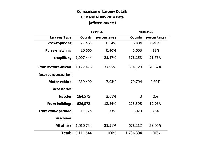 BIAS due to Non Response • Compare UCR and NIBRS reporting • Examine Breakdown of Violent and Property Crimes in NIBRS and UCR • Examine Larceny in NIBRS and UCR