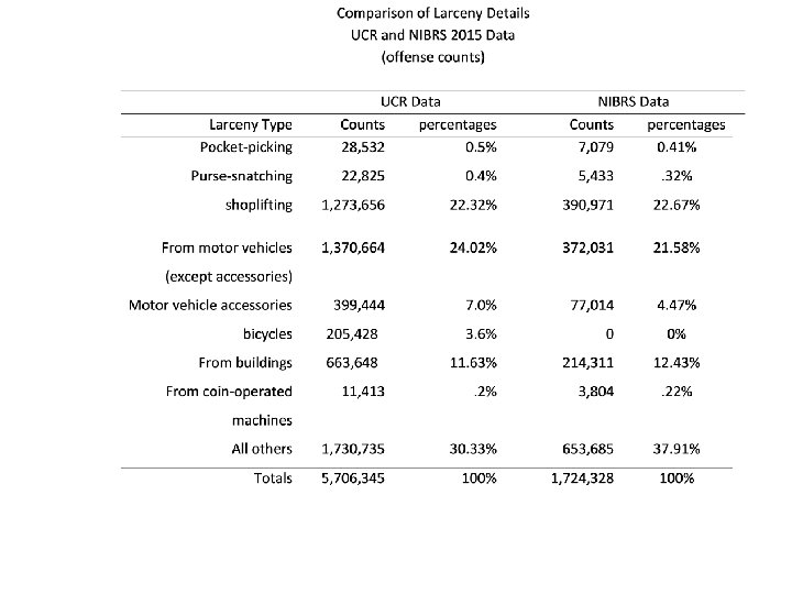 Breakdown of Property Crimes UCR and NIBRS (2014 and 2015) NIBRS % UCR (2015) (2014) Crime Type UCR (2014) UCR % Burglary 1, 729, 496 20. 90% 486, 554 20. 24% 1, 579, 527 19. 76% 461, 674 19. 44% Larceny 5, 858, 496 70. 77% 1, 736, 384 72. 24% 5, 706, 346 71. 39% 1, 724, 328 72. 60% 8. 85% 189, 072 7. 96% Motor Vehicle Theft 689. 527 8. 33% 180, 822 7. 52% 707, 758 UCR % NIBRS (2015) NIBRS %