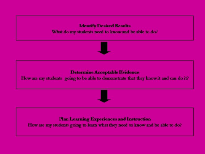 Now Ask Yourself… • Given the desired results and the identified assessments, what kind of instructional approaches, resources, and experiences are required to achieve these goals? • What do we do to help students reach the understandings at the heart of our unit? • Which learning activities promote understanding, knowledge, skill, student interest, and excellence?