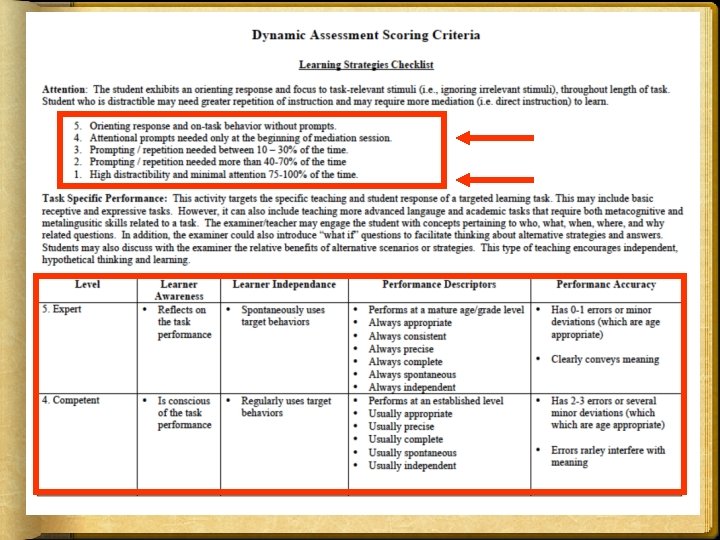 Principles of Dynamic Assessment A shift from static to fluid measures of ability. The assessor actively works to facilitate learning and induce active participation in the learner. Focus on process of learning rather than completing a specific product: Metacognitive & metalinguistic skills Produces info on modifiability & the means by which change is best accomplished.