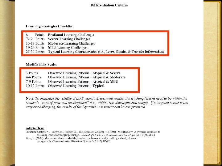 What the Research States Specificity rate of 95. 3% of classification of traditional learner (good – Plante & Vance, 1994) Sensitivity rate of 77. 8% of classification of low language ability (fair – Plante & Vance, 1994) Reliability was noted at. 82 and higher Gains were not due to the “practice effect” but due to the MLE treatment Traditional learners made significant gains during the short MLE ~ Pena, Iglesias, Lidz (2001)