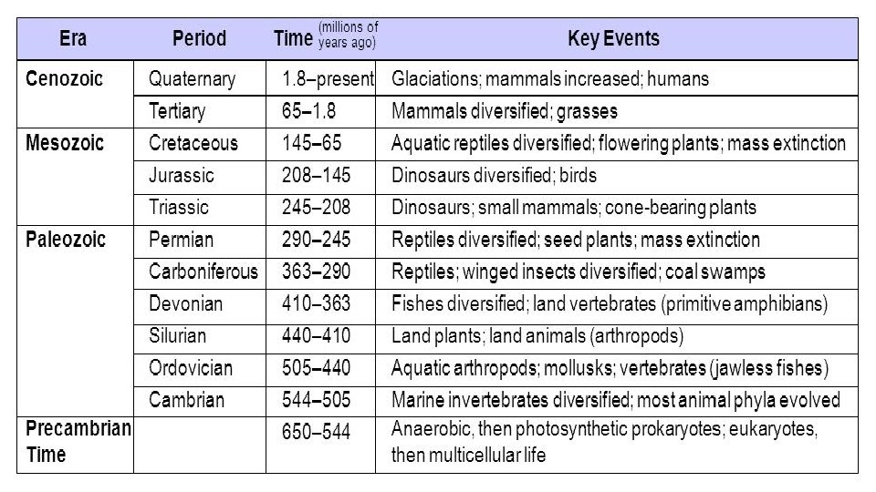 Cretaceous-Tertiary mass extinction (aka- K/T extinction) Wipe out of Dinosaurs Triassic-Jurassic mass extinction Many marine reptile, amphibians were lost Permian mass extinction (aka Great Dying) 96% of species died. All life on Earth today is descended from the 4% of species that survived Late Devonian mass extinction Three quarters of all species on Earth died out Ordovician-Silurian mass extinction Lots of sea creatures were lost