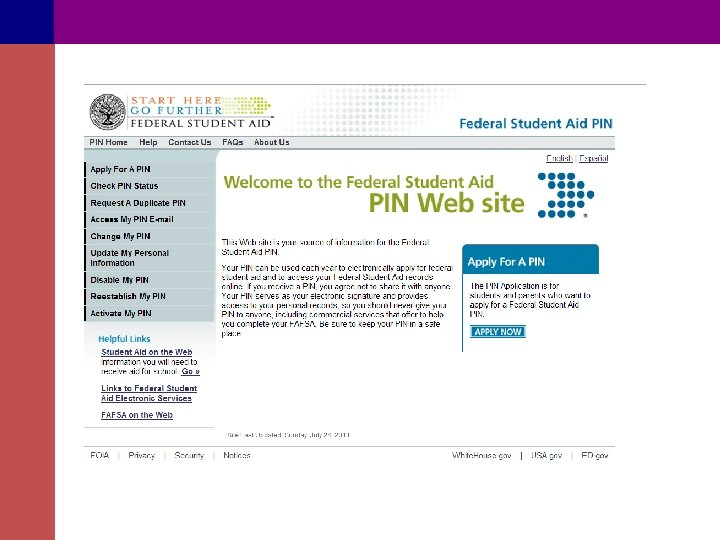 Get Organized o To complete the FAFSA you will need to: o Gather your and your parent’s 2011 tax information o Apply for a Personal Identification Number (PIN) o Parent must have his/her own PIN. o PIN serves as electronic signatures for the FAFSA and promissory notes www. pin. ed. gov