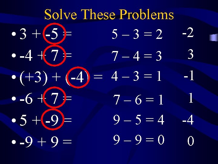 Solve the Problems -8 • -3 + -5 = 11 • 4+7= • (+3) + (+4) = 7 -13 • -6 + -7 = 14 • 5+9= -18 • -9 + -9 =
