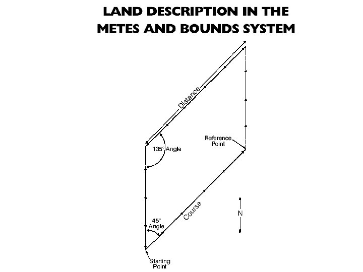 What are the systems of land measurement and legal description? • Starting point: A description according to the metes and bounds system must have a starting place or point of reference. The description continues for specified distances along lines called courses until the tract has been circumscribed and the starting point is again reached.