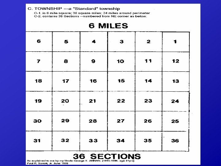 What are the systems of land measurement and legal description? In all surveys since 1796, the sections in each township have been numbered from 1 to 36, beginning at the upper right, or northeast, corner of the township.