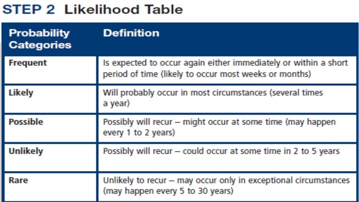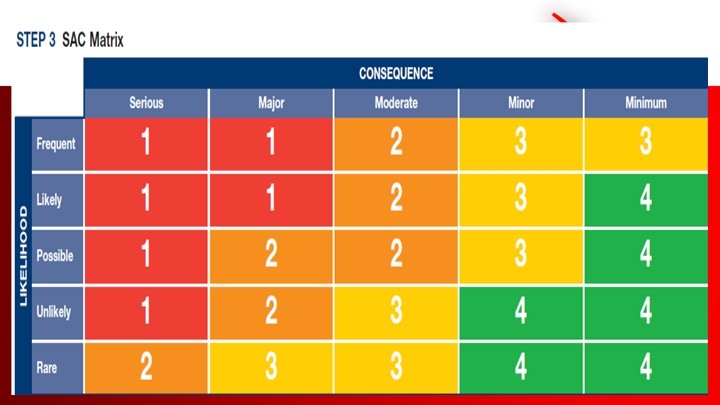 Assess the frequency and severity of the risk SAC (Severity Assessment Code) Score: it is a matrix scoring system/ numerical scores are given to the severity and likelihood of risks and these scores are multiplied to get a rating for the risk