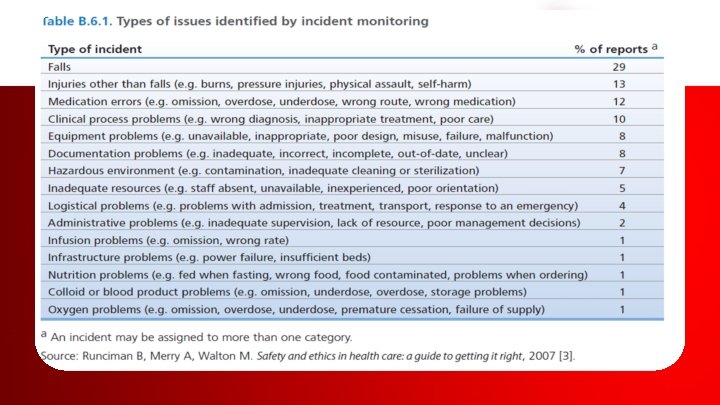 Activities Commonly Used to Manage Clinical Risk • Incident monitoring: • An incident: as an event or circumstance that could have or did lead to unintended and/or unnecessary harm to a person and/or a complaint, loss or damage. • Incident monitoring: refers to mechanisms for identifying, processing, analyzing and reporting incidents with a view to preventing their reoccurrence • The key to an effective reporting system is for staff to routinely report incidents and near misses.