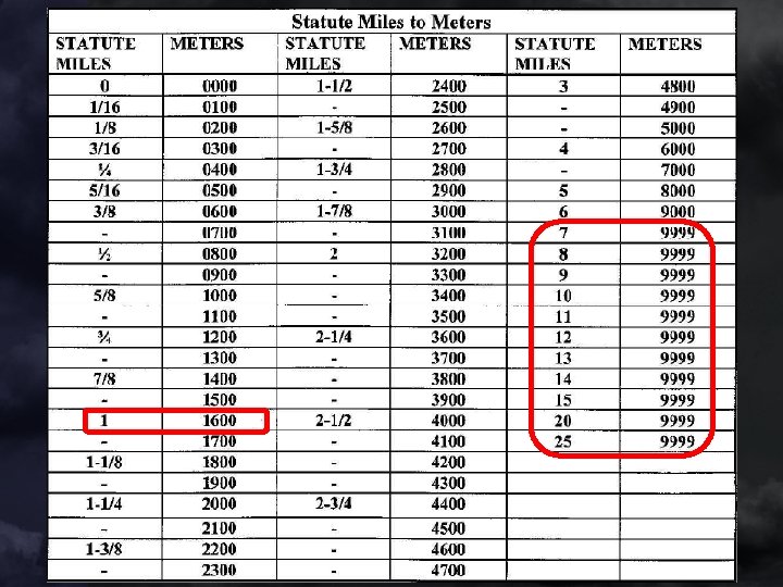 TAF Element Comparisons Military NWS Change Groups Becoming (BECMG) From (FM) Visibility Meters Statute Miles Minimum Altimeter Yes No Max/Min Temps Yes No Low-level Wind Shear Yes Turbulence Yes No Icing Yes No No Sig Wx (NSW) Yes No Remarks Yes No
