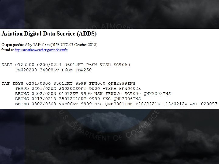 Even More Complexity… KDYS 2900/3000 05011 KT 9999 SKC QNH 3000 INS BECMG 2905/2906 07020 G 35 KT 9999 SKC 520004 QNH 2990 INS BECMG 2912/2913 35014 KT 3200 RASN BR OVC 030 620304 QNH 2988 INS BECMG 2915/2916 30011 KT 9999 NSW OVC 050 QNH 2992 INS T 08/2921 Z T 02/2911 Z LIMITED METWATCH 2906 TIL 2910