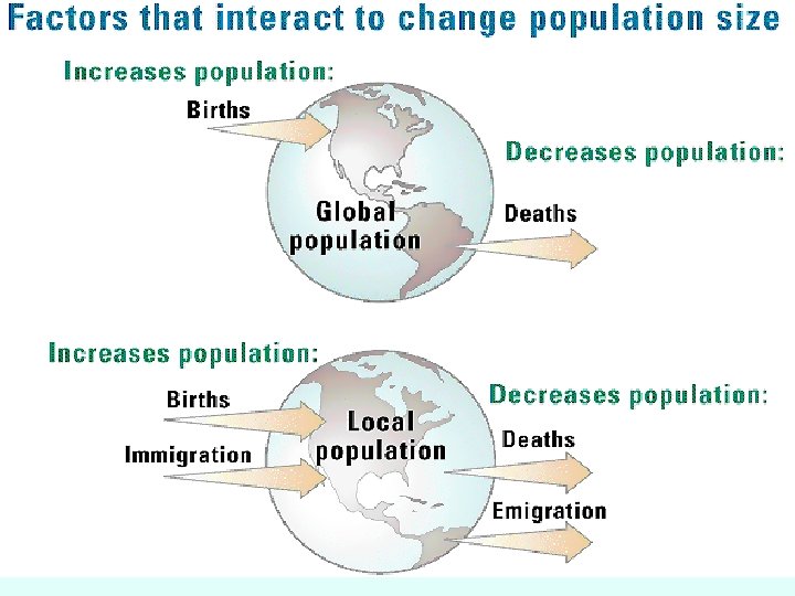 Immigration (i ) = • Migration of individuals INTO an area Emigration (e ) = • Migration of individuals OUT OF an area