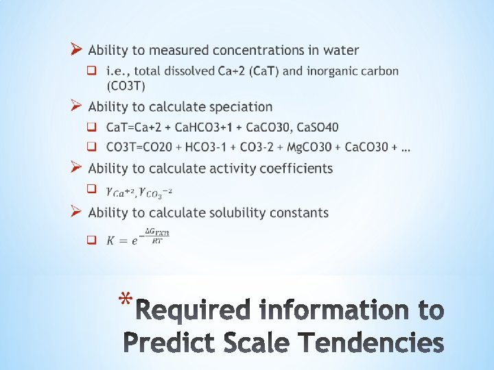Scale Fe. CO 3, siderite Fe. S, mackinawite Fe. S, pyrrhotite Fe(OH)3, amorphous iron hydroxide, rust Ca. CO 3, aragonite Ca 0. 5 Mg 0. 5 CO 3, dolomite Si. O 2, amorphous Scale Tendency Equation