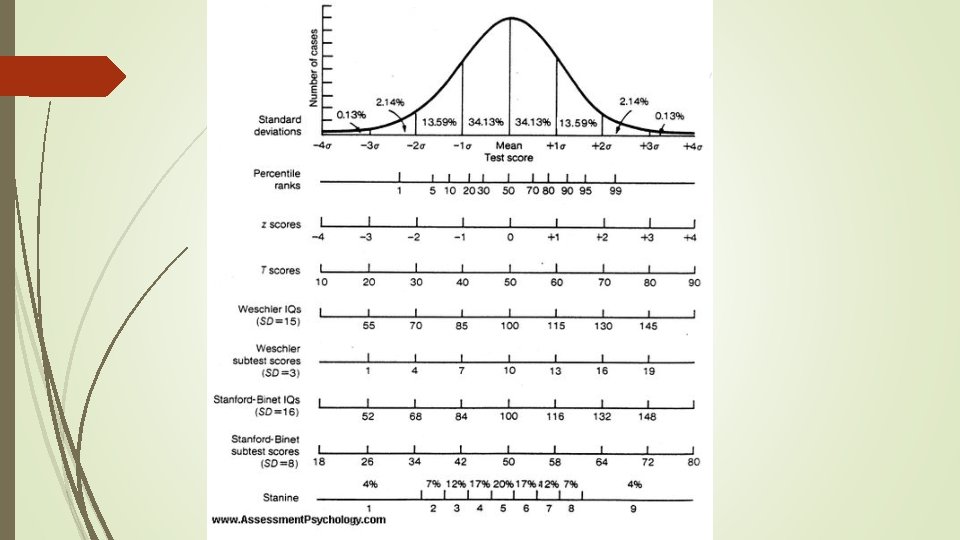 Statistics Percentile Rank: Easiest to use to get a quick idea. Tells how many percent of the population is at this level or less 12 th percentile for depressive symptoms = 12% of the population has this few depressive symptoms or less 95 th percentile for intelligence = 95 % of the population have an intelligence this high or less Standard Deviation (SD) – how far from the mean/norm. 68% are between +/- 1 SD (Average). 96% percent are between +/- 2 SD (Average + Above/Below Average) 2% are beyond this at either end (cognitive disability range or gifted). IQ: Mean = 100, SD = 15 T-Scores: Mean = 50, SD = 10 Assessment results (especially IQ) will often be given as a range (high certainty the measures ability or scale falls within that range)