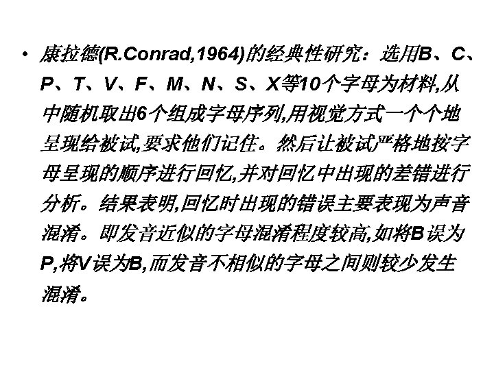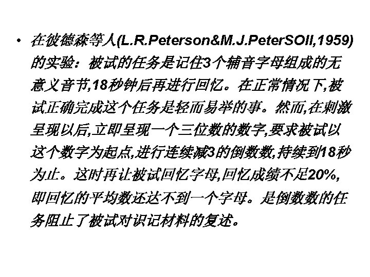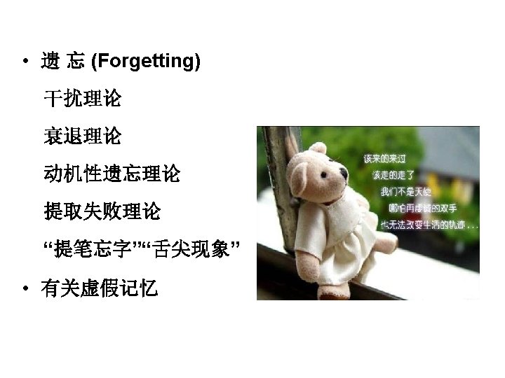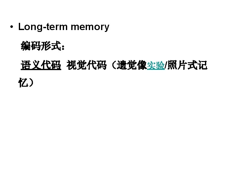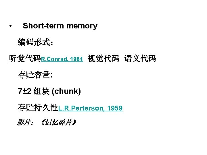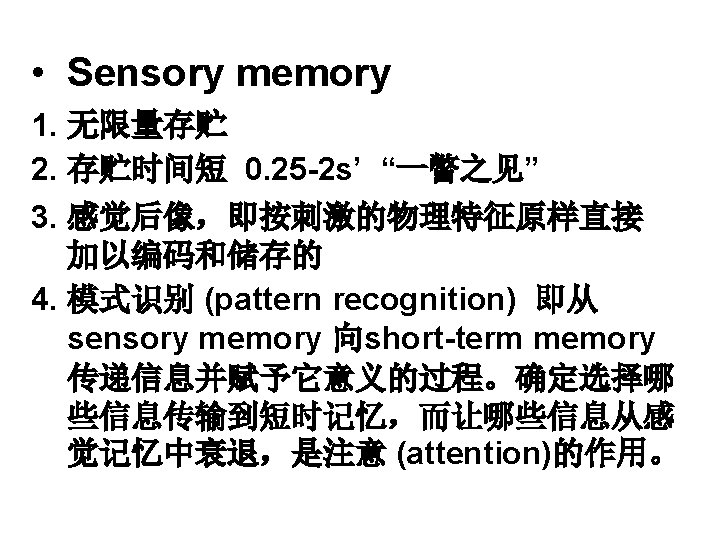 • Memory概述 • Memory 的过程 识记 (Memorization) 保持 (Retention) 再认 (Recognition) 再现 (Repruduction)