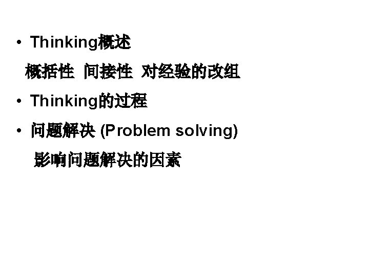 Key Words • Thinking The higher mental process which is the manipulation of mental respresentations of information • Problem solving The process of transforming one situation into another that meets a goal
