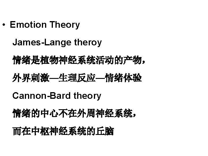 • Emotion 的分类 基本情绪 (Basic emotion) 快乐(Happiness) 悲哀(Sadness) 愤怒(Anger) 恐惧(Fear) 情绪状态的分类 心境(Mood) 激情(Affective impluse) 应激(Stress)