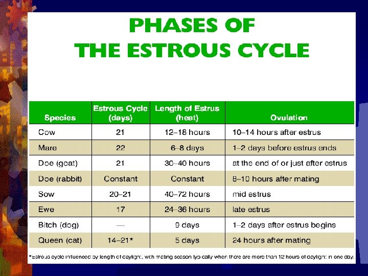 ® A. Estrus, also know as heat, is the period when the female is receptive to the male and will stand for mating. The length of estrus varies between species. ® Ovulation is when a mature ovum is released by the ovary. The number of eggs ovulated varies between species.