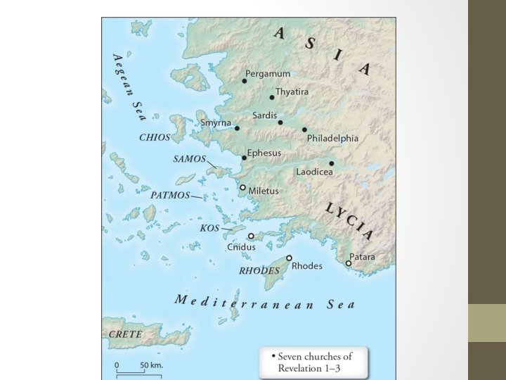 Revelation 1: 9 -20 9 I, John, your brother and companion in the suffering and kingdom and patient endurance that are ours in Jesus, was on the island of Patmos because of the word of God and the testimony of Jesus. 10 On the Lord’s Day I was in the Spirit, and I heard behind me a loud voice like a trumpet, 11 which said: “Write on a scroll what you see and send it to the seven churches: to Ephesus, Smyrna, Pergamum, Thyatira, Sardis, Philadelphia and Laodicea. ”