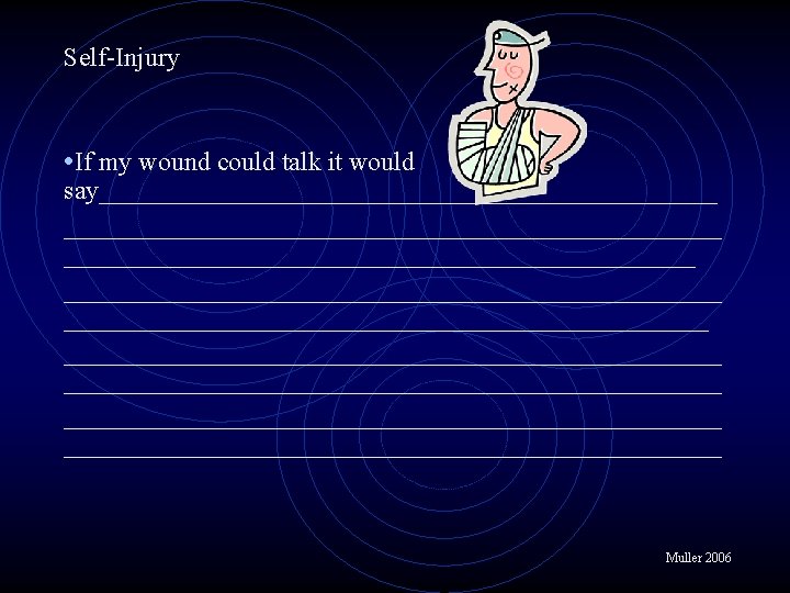 • Self-Injury Group Respond to the following statements by writing “A” for “agree” if you mostly agree with the statement or “D” for “disagree” if you mostly disagree. Be ready to explain your responses. ___Self-injurers are survivors. ___Self-injurers are weak people. ___Self-injurers are harming themselves to get attention. ___Self-injurers are perfectionists. ___Self-injury is a type of suicidal behavior. ___Self-injurers are proud of their scars. ___Self-injury helps people cope. ___Self-injurers are more sensitive than most other people. Muller 2006
