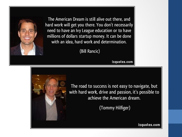 Andrew Carnegie: An Example of the American Dream A “Rags to Riches” story. Born in 1835 in Scotland, he immigrated to America in 1848 with his very poor parents. He worked hard and led the expansion of the steel industry. In 1901 he sold Carnegie Steel Company for $480 Million (in 2015, $13. 6 Bllion) He donated about 90% of his fortune.
