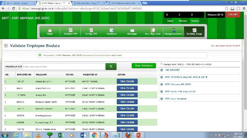VALIDATION TIMETABLE Ø As a policy, it is expected that Management Units shall validate and submit their SPVs within 48 hours after Payroll test report is dispatched. Ø Validators will be prompted by; ü Validation Time schedule ü SMS Text messages onto their mobile phones ü Schedule officers prompt during the validation period