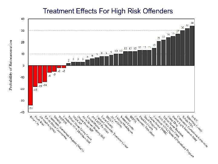 -60 AH Veterans TH Beekman MONDAY CTCC Canton TH Springrove Northwest CCC WORTH Diversified Oriana CCTC Oriana Summit Oriana Crossweah ARCA Booth H/Salv A CATS male RTP Crossroads Franklin Comm Trans Ctr STARK River City Talbert House CCC West Central EOCC Male ALL CBCF FACILITIES Comp. Drug AH Dunning Alternatives CCA RTC II Small Programs Harbor Light--D/A ALL HWH FACILITIES Oriana TMRC CATS male TC Fresh Start Dayton VOA NEOCAP Harbor Light--Corr Oriana RIP Licking-Muskingum Mahoning Cinti VOA D/A Oriana RCC STAR SOS Lucas CATS female RTP AH Price TH Turtle Creek Lorain-Medina Pathfinder Toledo VOA EOCC Female Oriana Cliff Skeen SEPTA AH Alum Creek Mansfield VOA TH Cornerstone CCA RTC I % Difference in Rate of New Felony Conviction Treatment Effects for High Risk 60 50 40 30 20 10 0 -10 -20 -30 -40 -50
