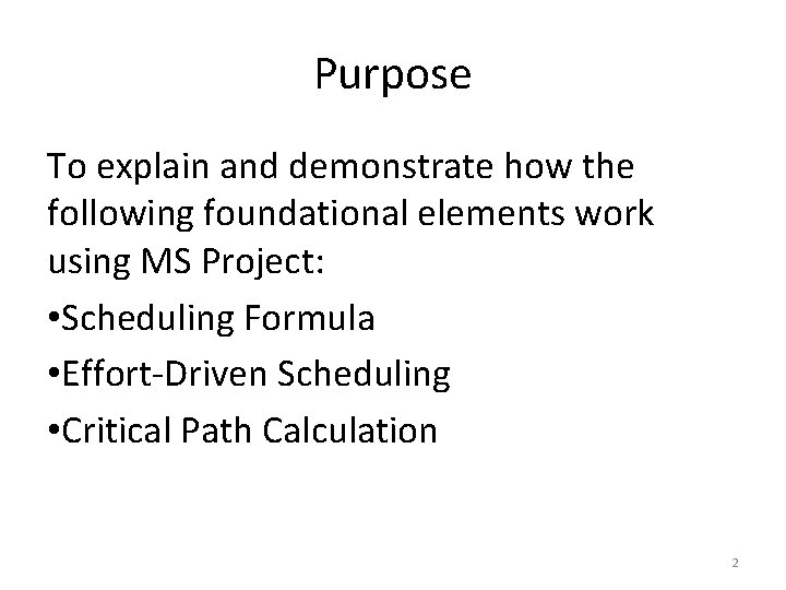 Purpose To explain and demonstrate how the following foundational elements work using MS Project: • Scheduling Formula • Effort-Driven Scheduling • Critical Path Calculation 2