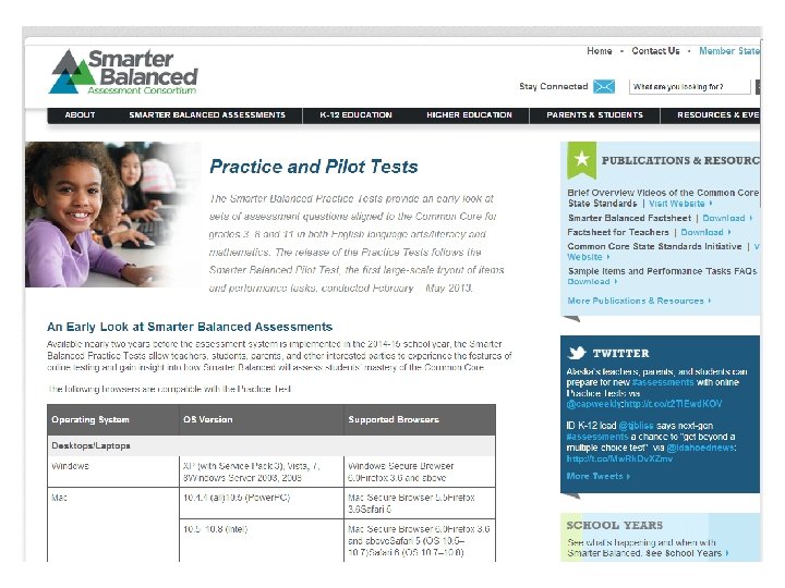 Summative Assessment: Two-pronged Approach Computer Adaptive Test • Assesses the full range of Common Core in English language arts/literacy and mathematics for students in grades 3 -8 and 11 (interim assessments can be used in grades 9 and 10) • Measures current student achievement and growth across time, showing progress toward college and career readiness • Includes a variety of question types: selected response, short constructed response, extended construction response, technology enhanced Performance Tasks • Extended projects demonstrate realworld writing and analytical skills • May include online research, group projects, presentations • Require 1 to 2 class periods to complete • Included in both English language arts/literacy and mathematics assessments • Applicable in all grades being assessed • Evaluated by teachers using consistent scoring rubrics