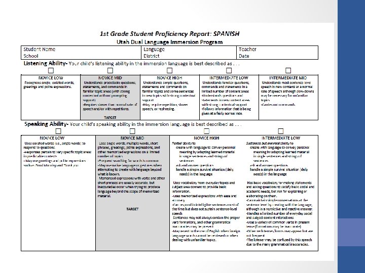 Student Proficiency Report • Communicates proficiency, or what the students can do with the language. • Follows the national ACTFL standards (American Council of Teachers of Foreign Languages) used across the nation to communicate language proficiency. • http: //actflproficiencyguidelines 2012. org/