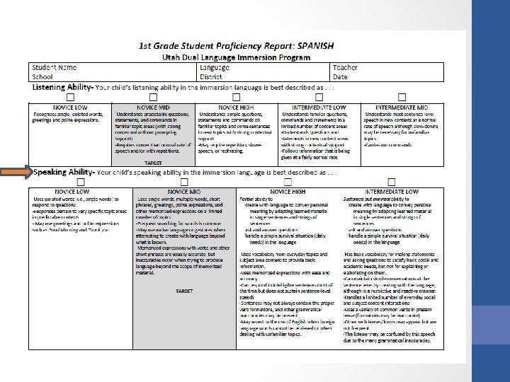 st 1 grade • Area: Listening • Shaded box is the target for the grade level. • Checked box is your student’s level.