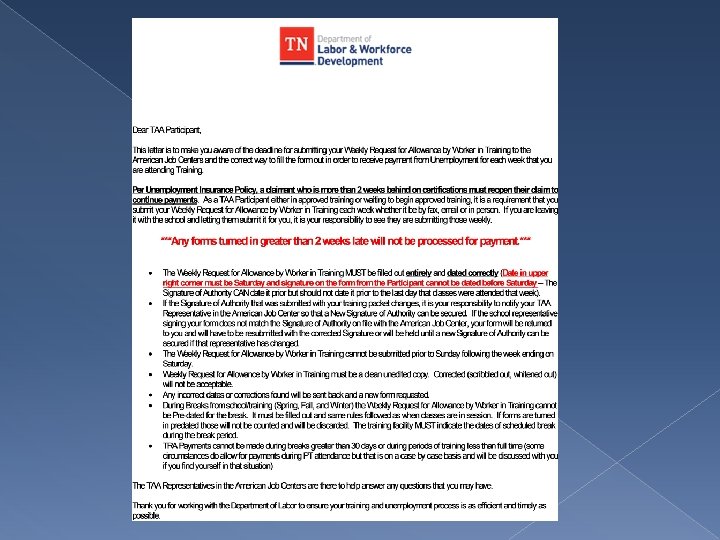 How does a participant get started – First Steps � � � The first thing an applicant must do to is come into the American Job Center and speak with their Representative to discuss training needs and goals TAA Application needs to be done Claimant needs to be sure to register with our department on jobs 4 tn. gov. AJC Representative should email their TRA Representative to notify them of the applicant TRA Representative will follow up with AJC Representative as to their status on Unemployment or TRA If there is a CURRENT Unemployment claim on file, TRA Unit will go ahead and do the TRA Application and the claimant will begin receiving documents pertaining to their TRA Eligibility, Monetary Determination, and Deadlines
