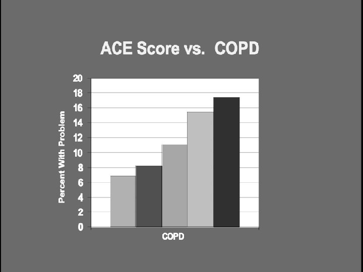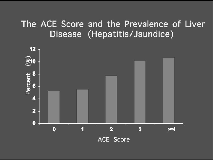 The Higher the ACE Sore , the greater the likelihood of: Severe and persistent emotional problems Health risk behaviors Serious social problems Adult disease and disability High health and mental health care costs Poor life expectancy The following information and slides are from September 2003 Presentation at “Snowbird Conference” of the Child Trauma Treatment Network of the Intermountain West, by Vincent J. Felitti, MD. And from Lanius/Vermetten Book Chapter 6/2007