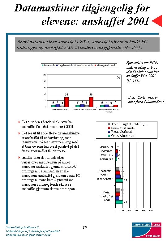 Datamaskiner tilgjengelig for elever: alder Hvor mange av skolens datamaskiner er fra. . . (prosent av totale antall datamaskiner tilgjengelig for elevene) (N=569) % Base: Skoler med en eller flere datamaskiner. 4 Maskinparken ser ut til å være eldst blant barneskolene hvor 22% av datamaskinene tilgjengelig for eleven er fra 1994 eller eldre. 4 Videregående skoler er har flest nye datamaskiner. Hele 49% av maskinparken for elevene er fra 1999 eller nyere. Dette er en betydelig høyere andel enn øvrige skoletrinn. Videregående skoler har svært få maskiner som er fra 1994 eller eldre (6%). 4 Ungdomsskolene ser ut til at å den største andelen av sine datamaskiner i alderen 1997 -1998. Kombinertskolene følger det samme mønsteret. 4 Det er skoler i Trøndelag/Nord-Norge og Oslo/Akershus som har flest nye maskiner. Norsk Gallup Institutt AS Undervisnings- og forskningsdepartementet Undersøkelsen er gjennomført 2002 14 %