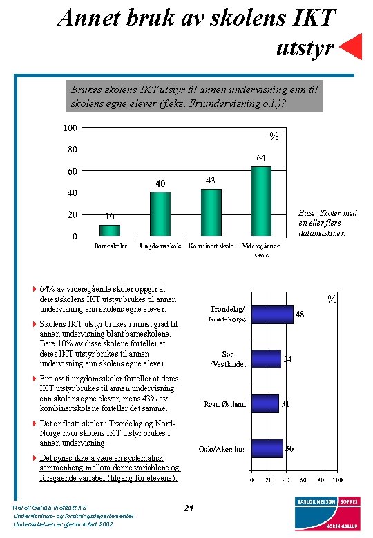 Elevenes tilgang til IKT utenom ordinær undervisning Kan eleven disponere noe av skolens IKT utstyr. . . (N=569) Base: Skoler med en eller flere datamaskiner. 4 Tilgjengeligheten av IKT utstyr for elevene utenfor ordinær undervisning er størst for videregående skole. 97% av videregående skole oppgir at elevene har tilgang på skolens IKT utstyr innenfor skoletiden, men utenfor ordinær undervisning og 62% oppgir at elevene har tilgang på skolens IKT utstyr utenom skoletiden. 4 Blant barneskolene oppgir 58% at elevene har tilgang til skolens IKT utstyr innenfor skoletiden, men utenfor ordinær undervisning. 19% av skolene har utstyr tilgjengelig utenom skoletiden. 4 Tilgjengeligheten i ungdoms- og kombinertskole er noe høyere enn barneskolene, men betydelig lavere enn videregående skole. Resultatene indikerer at kombinertskolene stiller sitt utstyr tilgjengelig for elevene i ungdomstrinnet. 4 Tilgjengeligheten av IKT utstyr er størst i Trøndelag og Nord-Norge, mens de øvrige geografiske områdene synes like. Utvalgsstørrelsen tillater ikke ytterligere nedbrytning, for eksempel på skoletrinn. Norsk Gallup Institutt AS Undervisnings- og forskningsdepartementet Undersøkelsen er gjennomført 2002 20