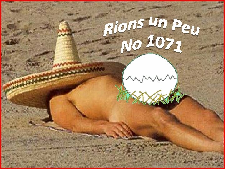 Dans un hôpital psychiatrique, un médecin affiche un poster représentant une plage puis observe ses patients. Tous essaient de se jeter à l’eau. Mais l’un d’eux reste sur sa chaise. Formidable ! Vous êtes guéri, vous n’avez pas bougé ! Ben, je ne veux pas être viré. Je suis le maître-nageur et je suis obligé de rester à mon poste pour m’assurer qu’aucun baigneur ne se noie.