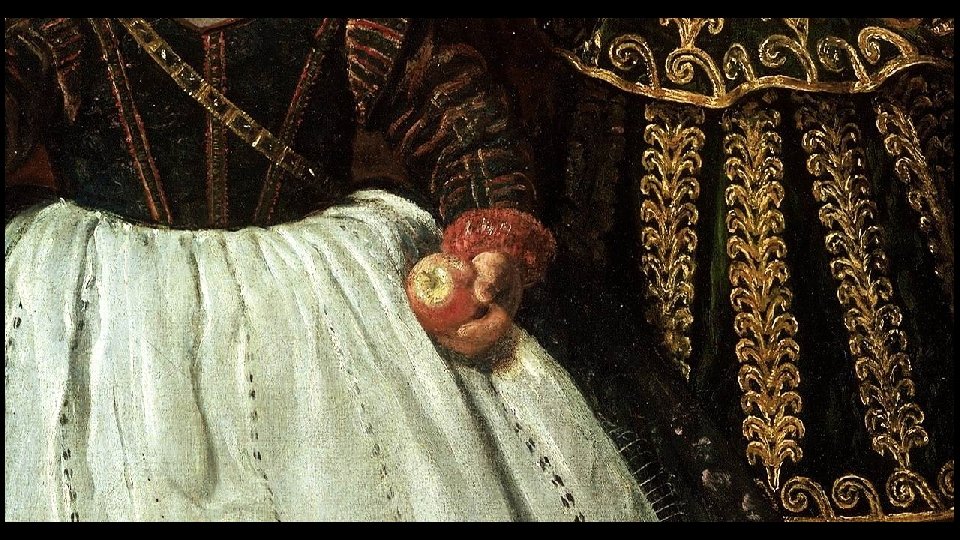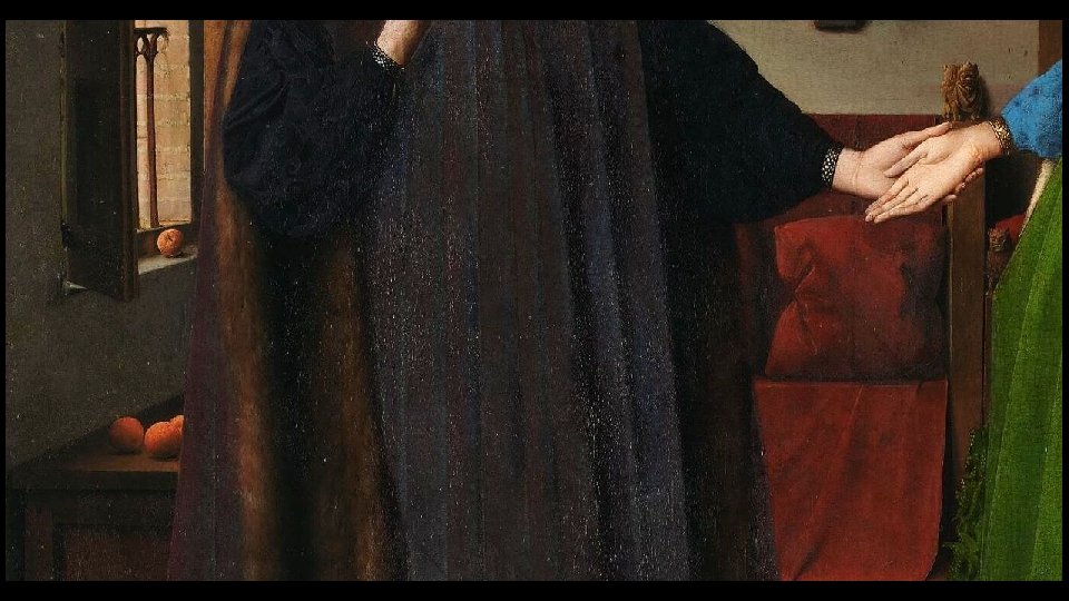 les oranges rappellent l'innocence d'avant le péché originel mais. . . s’il s’agit de pommes (il est difficile d’en être sûr), celles-ci seraient un symbole de la tentation et de la chute Jan van Eyck Portrait of Giovanni Arnolfini and his Wife Les Époux Arnolfini 1434 National Gallery, London