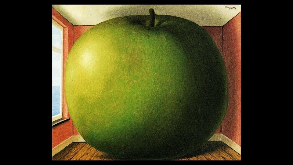 pomme démesurée, hypertrophiée le fruit occupe tout l’espace, ce grossissement est troublant du fait que l’objet tient normalement dans la main Magritte remet en question l’échelle humaine. . . Rene Magritte The Listening Room La Chambre D'Ecoute 1952 Menil Collection, Houston