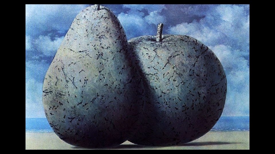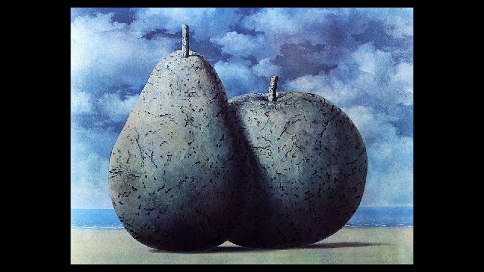 une plage devant la mer et nuages une poire et une pomme pétrifiées … une nature morte ? dans l'esprit du surréaliste qu'est Magritte sans doute pas! il s'agit ici de l'image d'une pomme et de l'image d'une poire non des fruits eux mêmes Rene Magritte Memory of a Voyage Souvenirs de Voyage 1959 Collection privée