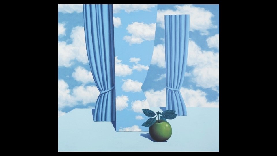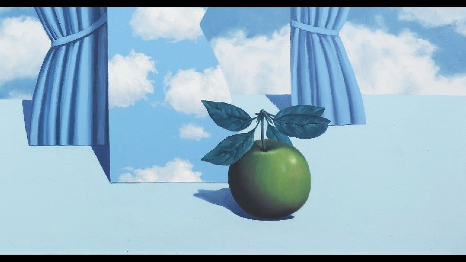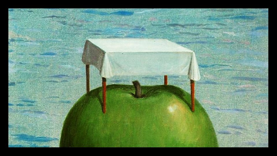 le nanisme la table recouverte d'une nappe en lin et le gigantisme de la pomme qui flotte librement une logique inversée. . . l'incertitude règne et c'est précisément ce que vise Magritte Rene Magritte Les belles réalités Fine realities 1964 Collection privée