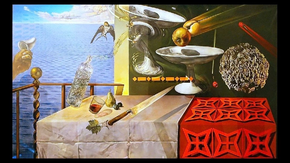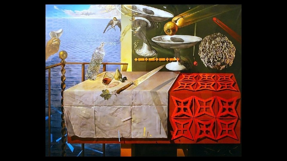 période du « mysticisme nucléaire » … une nature morte en suspension dans l'air choses et d’objets, de présences matérielles et immatérielles circulent, volent, se laissent entrevoir et sentir. . . le compotier et la pomme en mouvement se dédoublent et se distordent Salvador Dali Nature Morte Vivante Still Life-Fast Moving 1956 The Dali Museum, St. Petersburg, Florida
