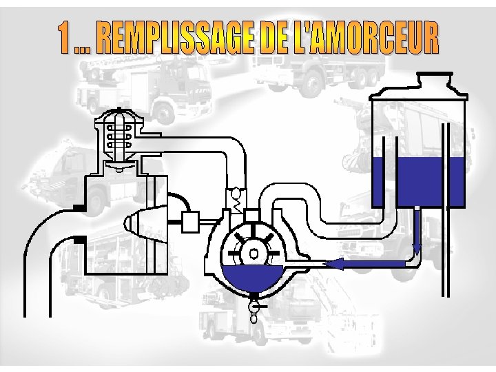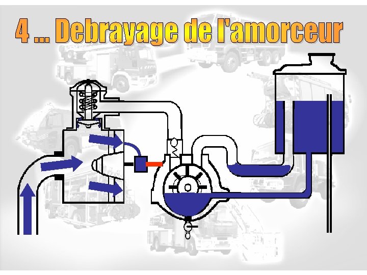 Bac d’amorçage Clapet d ’amorçage Tuyau de retour Clapet anti-retour Pompe Vérin de débrayage Ligne d’aspiration Purge Amorceur Tuyau de trop plein