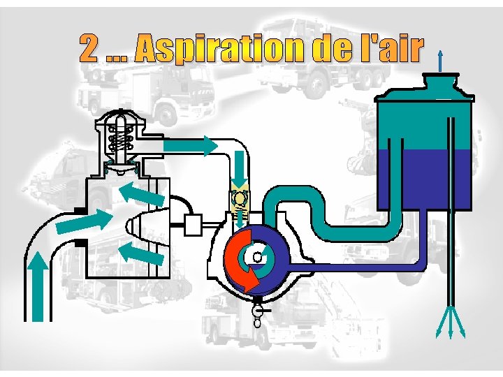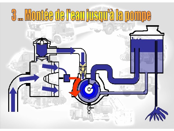 Principe de l’aspiration L’amorceur se met en fonction amorceur Ouverture de la vanne d’aspiration Ligne d’aspiration L’amorceur crée le vide Arbre de transmission pompe P atm