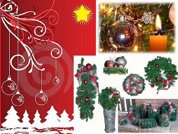 Pour la décoration pour du Noël on doit avor: 1. un sapin bien ordinaire vert; 2. des guirlandes; 3. des lamelles épaisses; 4. des Noël flocons de neige; 5. des petits jouets; 6. une petite star; 7. des petites statues des anges; 8. un petit pignon