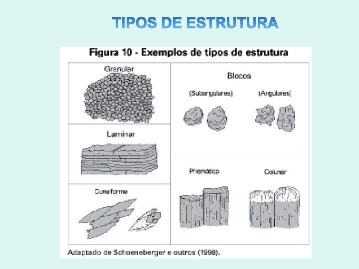 Definição: Arranjamento das partículas do solo e do espaço poroso entre elas; incluindo ainda o tamanho, forma e arranjamento dos agregados formados quando partículas primárias se agrupam, em unidades separáveis. Ø Tem relação direta com a produção das culturas Importância da estrutura: - Aeração - Armazenamento e circulação de água - Penetração de raízes - Disponibilidade de nutrientes - Atividades macro e micro biológicas - Temperatura do solo