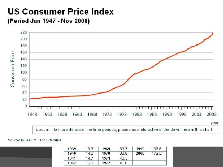 • DETERMINING INFLATION Inflation = CPI in year 2 – CPI in year 1 X 100 CPI in year 1 • 2008 – 215. 30 • 2007 – 207. 34 • 215. 30 – 207. 34 = 7. 96 • 7. 96/207. 34 • . 0384 • =. 0384 X 100 = 3. 84% Prices have inflated by 3. 84% from 2007 to 2008