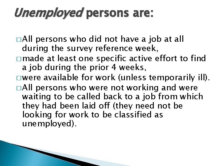 Unemployed persons are: � All persons who did not have a job at all during the survey reference week, � made at least one specific active effort to find a job during the prior 4 weeks, � were available for work (unless temporarily ill). � All persons who were not working and were waiting to be called back to a job from which they had been laid off (they need not be looking for work to be classified as unemployed).