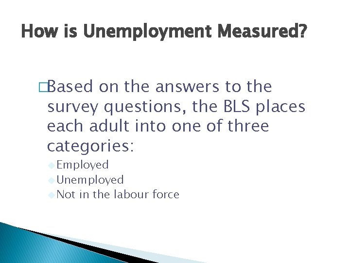 How is Unemployment Measured? �Based on the answers to the survey questions, the BLS places each adult into one of three categories: u Employed u Unemployed u Not in the labour force