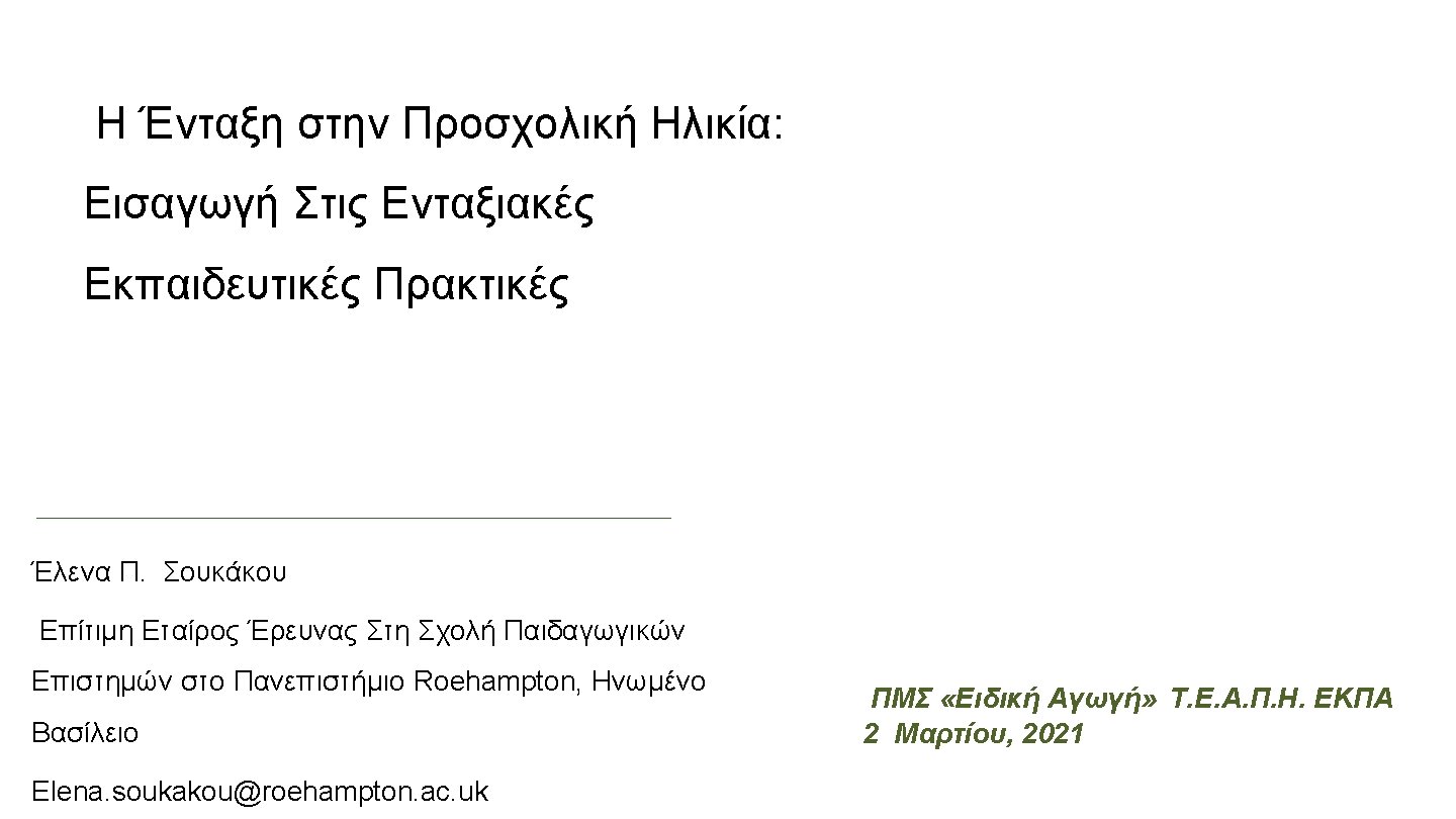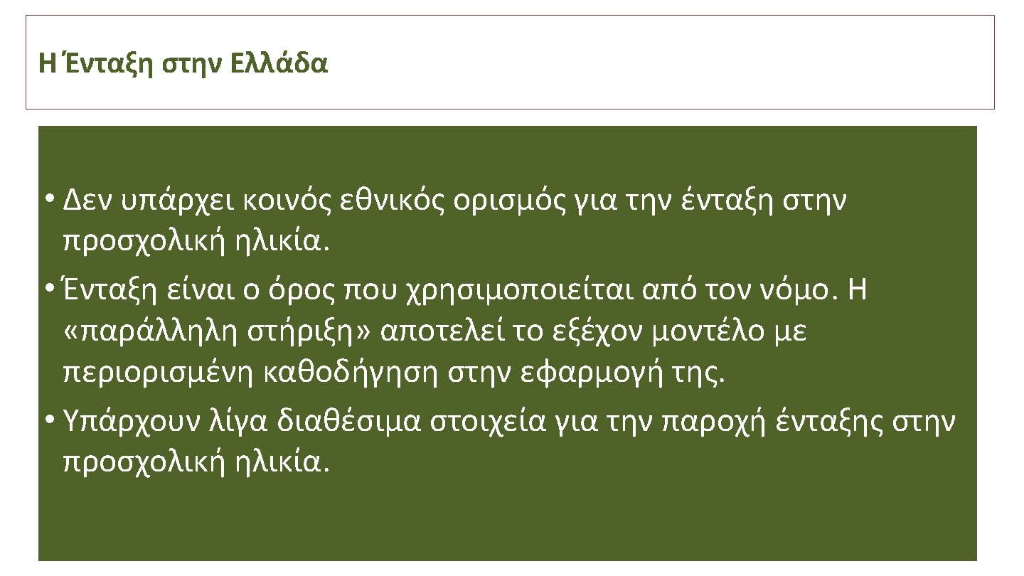 Βιβλιογραφία • DEC/NAEYC. (2009). Early childhood inclusion: A joint position statement of the Division for Early Childhood (DEC) and the National Association for the Education of Young Children (NAEYC). Retrieved from: https: //www. naeyc. org/sites/default/files/globally-shared/downloads/PDFs/resources/positionstatements/DEC_NAEYC_EC_updated. KS. pdf • NPDCI. (2011). Research synthesis points on quality inclusive practices http: //npdci. fpg. unc. edu/sites/npdci. fpg. unc. edu/files/resources/NPDCI-Research. Synthesis. Points. Inclusive. Practices-2011_0. pdf • National Professional Development Center on Inclusion. (2011). Research synthesis points on practices that support inclusion. Chapel Hill: The University of North Carolina, FPG Child Development Institute, Author. Available at http: //npdci. fpg. unc. edu • International Institute for Educational Planning / United Nations Educational, Scientific and Cultural Organization) (2020) Planning for inclusive education. Retrieved from: http: //www. iiep. unesco. org/en/inclusive-education • Law 4368 (2016). Measures to speed up government work and other provisions. Government Gazette, 1 (21), 537 -612. Athens: National Printing House [in Greek]. • Odom, S. L. , Vitztum, J. , Wolery, R. , Lieber, J. , Sandall, S. , Hanson, M. J. , et al. (2004). Preschool inclusion in the United States: A review of research from an ecological systems perspective. Journal of Research in Special Educational Needs, 4(1), 17 -49. • UNESCO (2019). Global Education Monitoring Report. Migration, displacement & education: Building bridges, not walls. Available at: en. unesco. org/gem-report/2019/migration • United Nations (2006). Convention on the Rights of Persons with Disabilities. New York: United Nations. • Νόμος υπ’ αριθμόν 3699/Φ. Ε. Κ. 199/Α΄/2. 10. 2008. Ειδική Αγωγή και Εκπαίδευση των ατόμων με αναπηρία ή με ειδικές εκπαιδευτικές ανάγκες (2008). Εφημερίδα της Κυβέρνησης της Ελληνικής Δημοκρατίας, τεύχ. 1, αριθ. φύλλου 199, σελ. 3499 -3520. • United Nations (2016). General Comment No. 4. Article 24: Right to Education. Convention on the Rights of Persons with Disabilities. • UNESCO (1994). The Salamanca Statement and Framework for Action on Special Needs Education. Paris: UNESCO. • UNESCO (2005). Guidelines for Inclusion: Ensuring Access for All. Paris