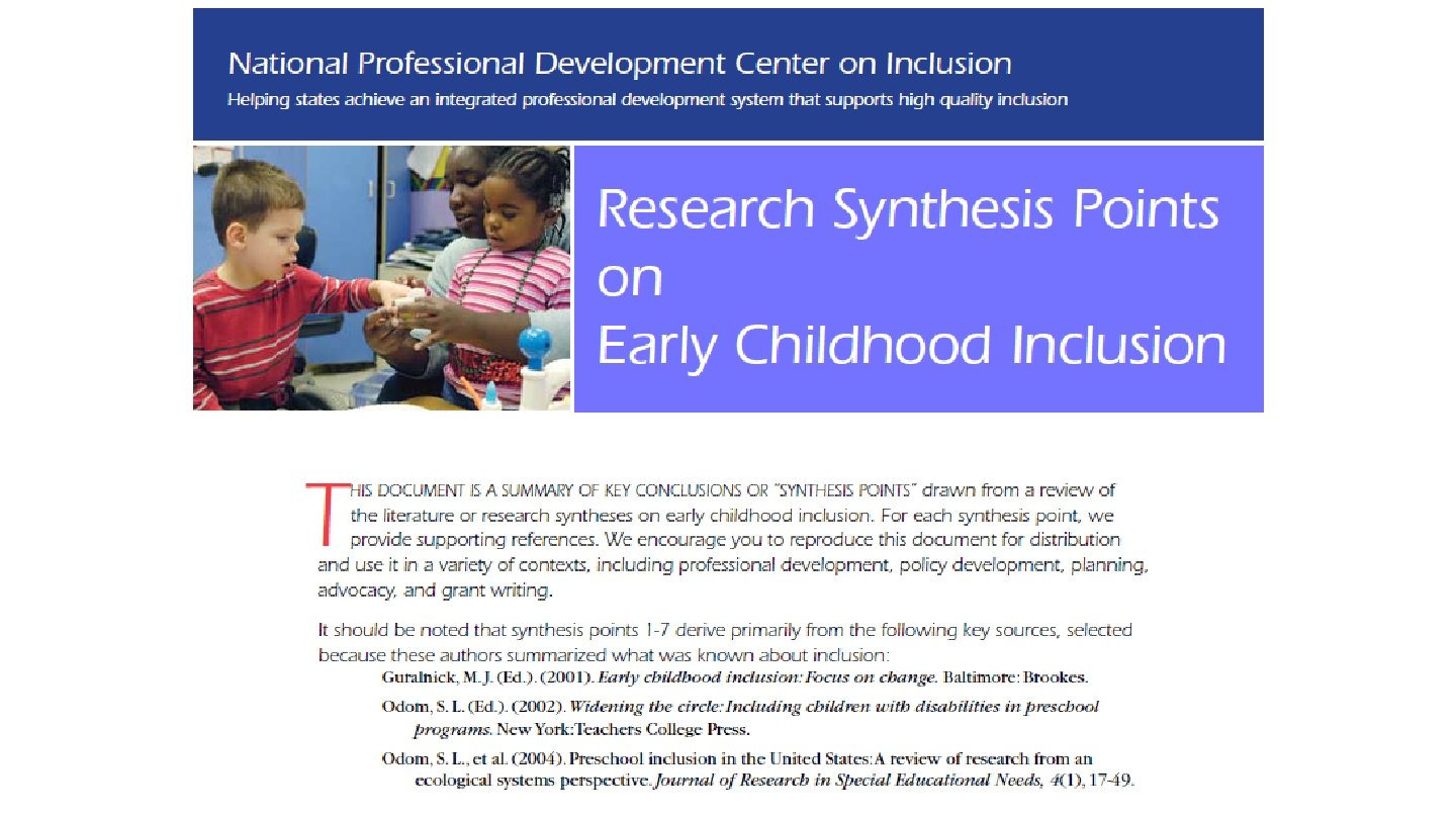Desired Outcomes of Inclusion for ALL Children and Their Families • A sense of belonging and membership • Positive social relationships and friendships • Development and learning for all children Access Participation Supports