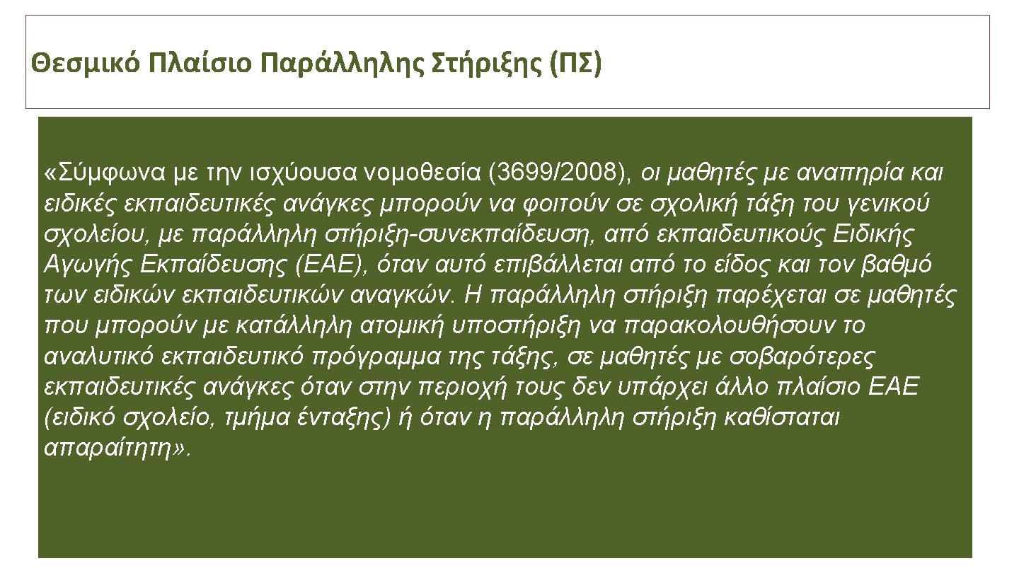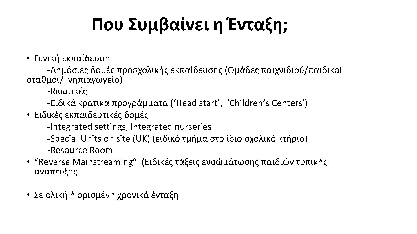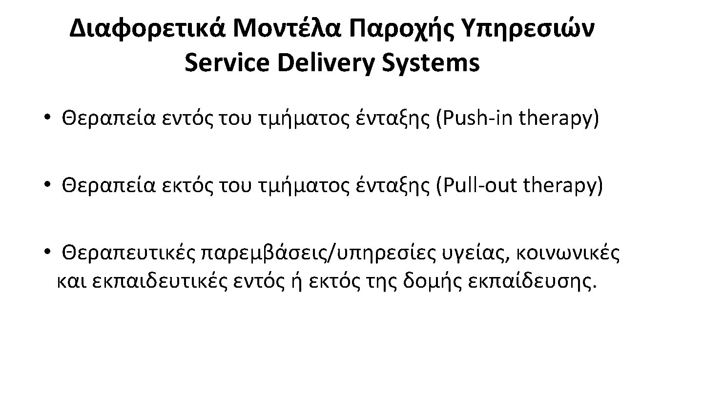 Διαφορετικά Μοντέλα Παράλληλης Στήριξης • Early childhood education teacher • Learning support assistant/ Itinerant teaching/Special Education Needs Teacher • Collaborative Team Teaching (CTT) • Consultation Models • Blended Programs